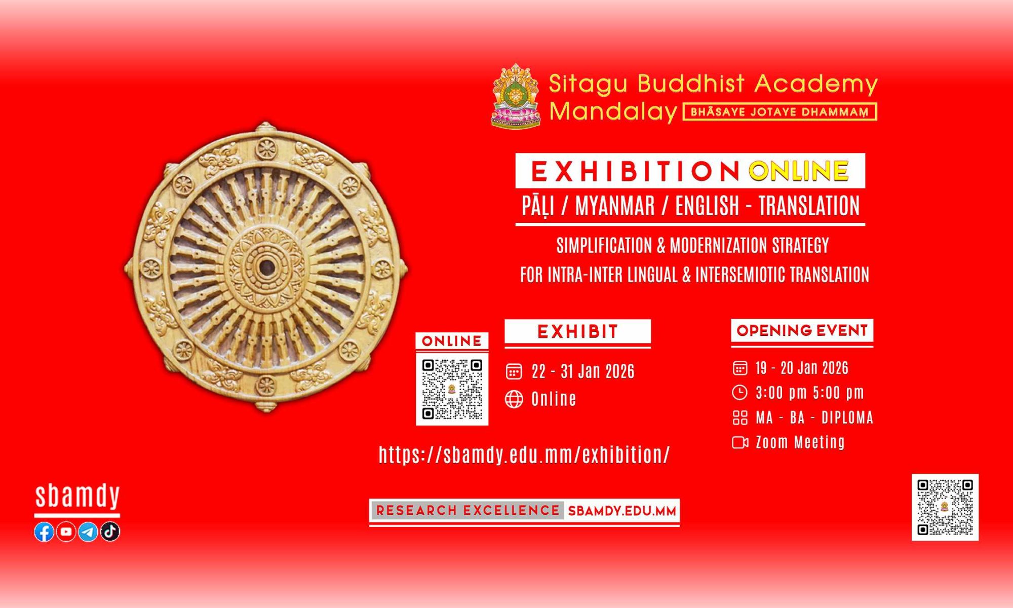 | Presenter: MA – BA – DIPLOMA Team Date: 19 – 20 Jan 2025 Time: 3:00 pm – 5:00 pm Online – Zoom Meeting | Date: 22 – 31 Jan 2025 Online @ https://sbamdy.edu.mm/exhibition/ |
