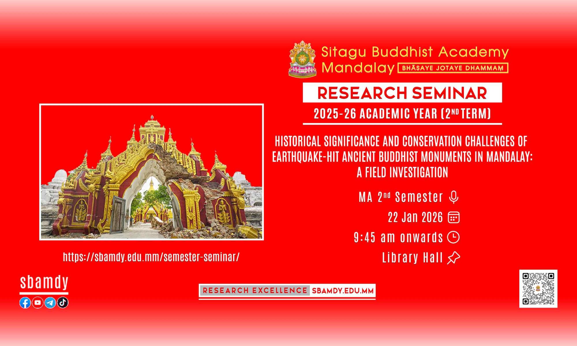 | Research Seminar | Historical Significance and Conservation Challenges of Earthquake-hit Ancient Buddhist Monuments in Mandalay: A Field Investigation | Date: 22 Jan 2026 Time: 9:45 am onwards Presenter: MA 2nd Semester Venue: Library Hall |